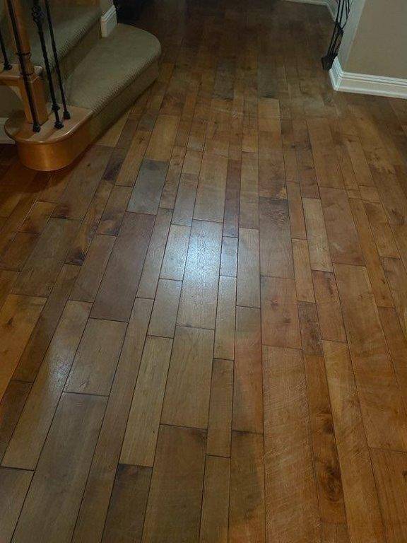 Here’s the before and after of a prefinished engineered American Walnut floor we refinished in Morgan Hill. The original floor, installed about 15 years ago, suffered from heavy scratching damage and fading from the sun. It was originally stained but we finished it with its natural color.